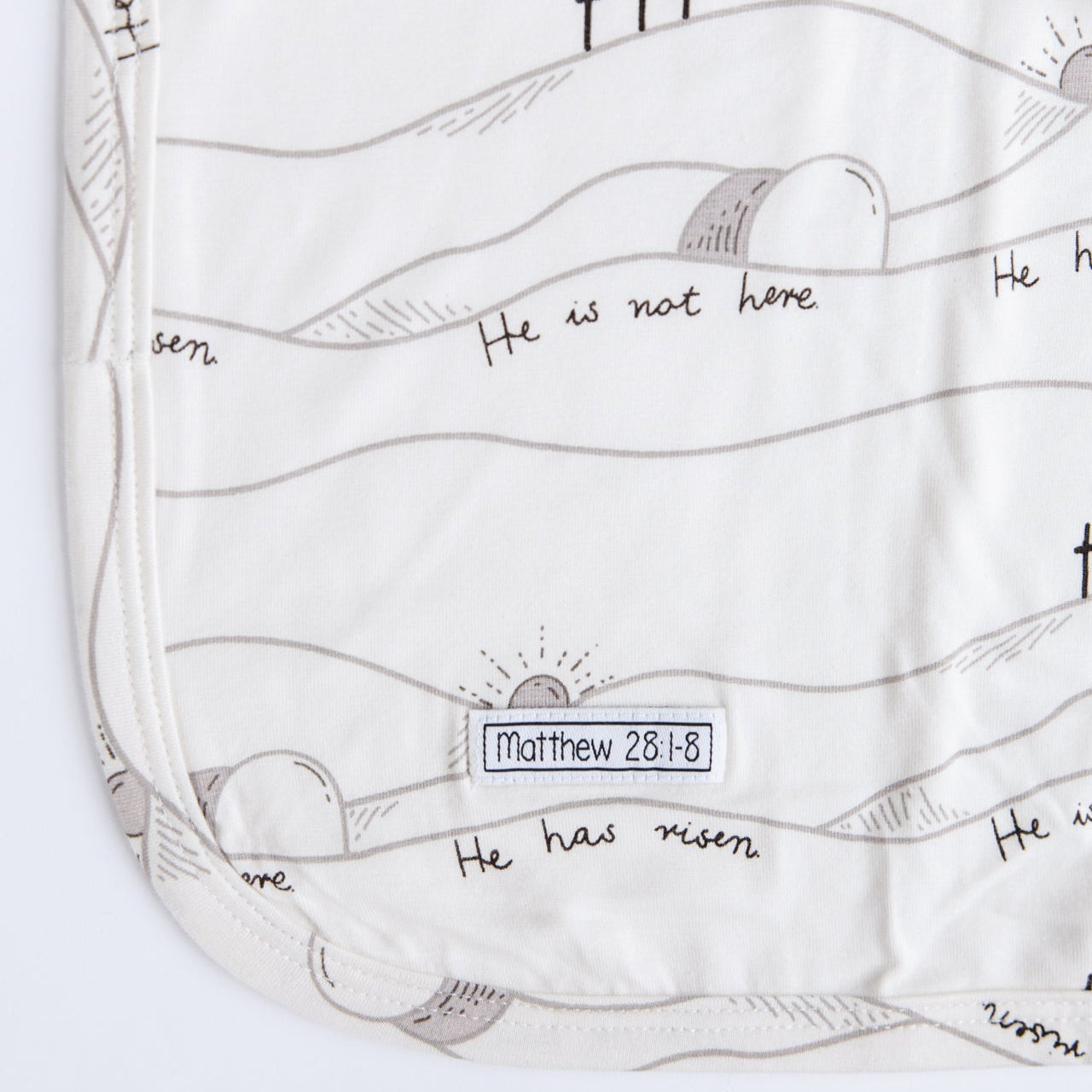This peaceful design illustrates the calm scene very early Sunday morning as the Son (and sun 😊) rises. Crosses standing high on the hills and an empty tomb with the stone rolled away under the soft skies. This simple and elegant design is one of my favorites and is the perfect addition to celebrate faith, hope, and the joy of Easter morning.