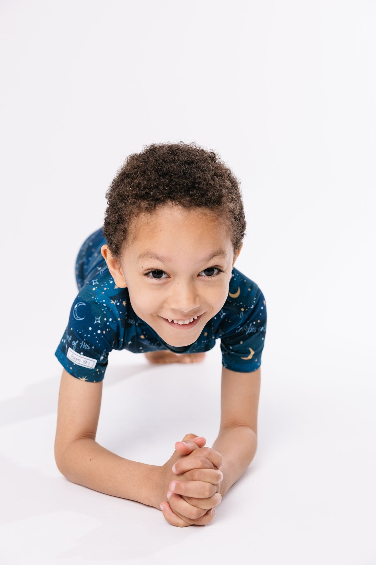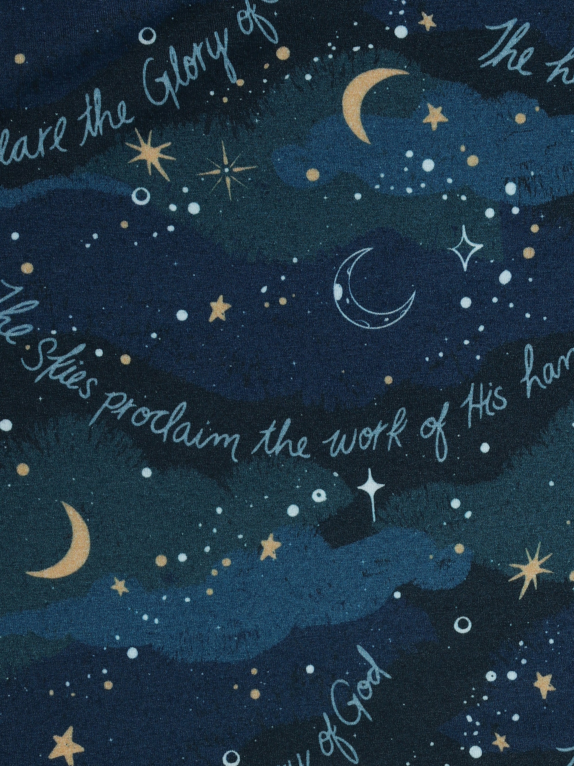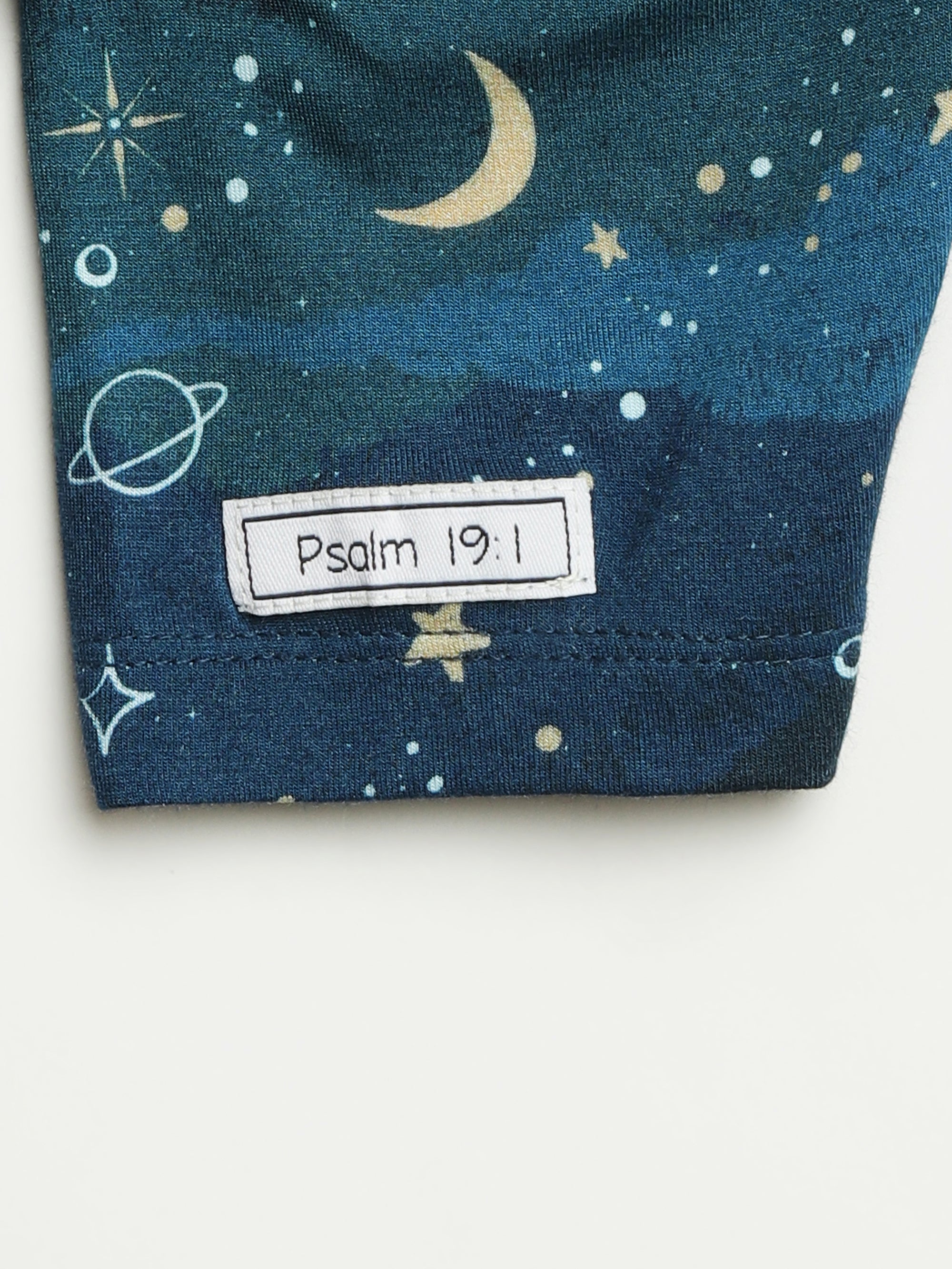 Let the stars spark wonder and the Word stir worship. This celestial print is designed to inspire awe in God's majesty and creativity. With hand-drawn planets, stars, and moons in soft, dreamy colors, this pajama set invites children to reflect on the greatness of God every night.