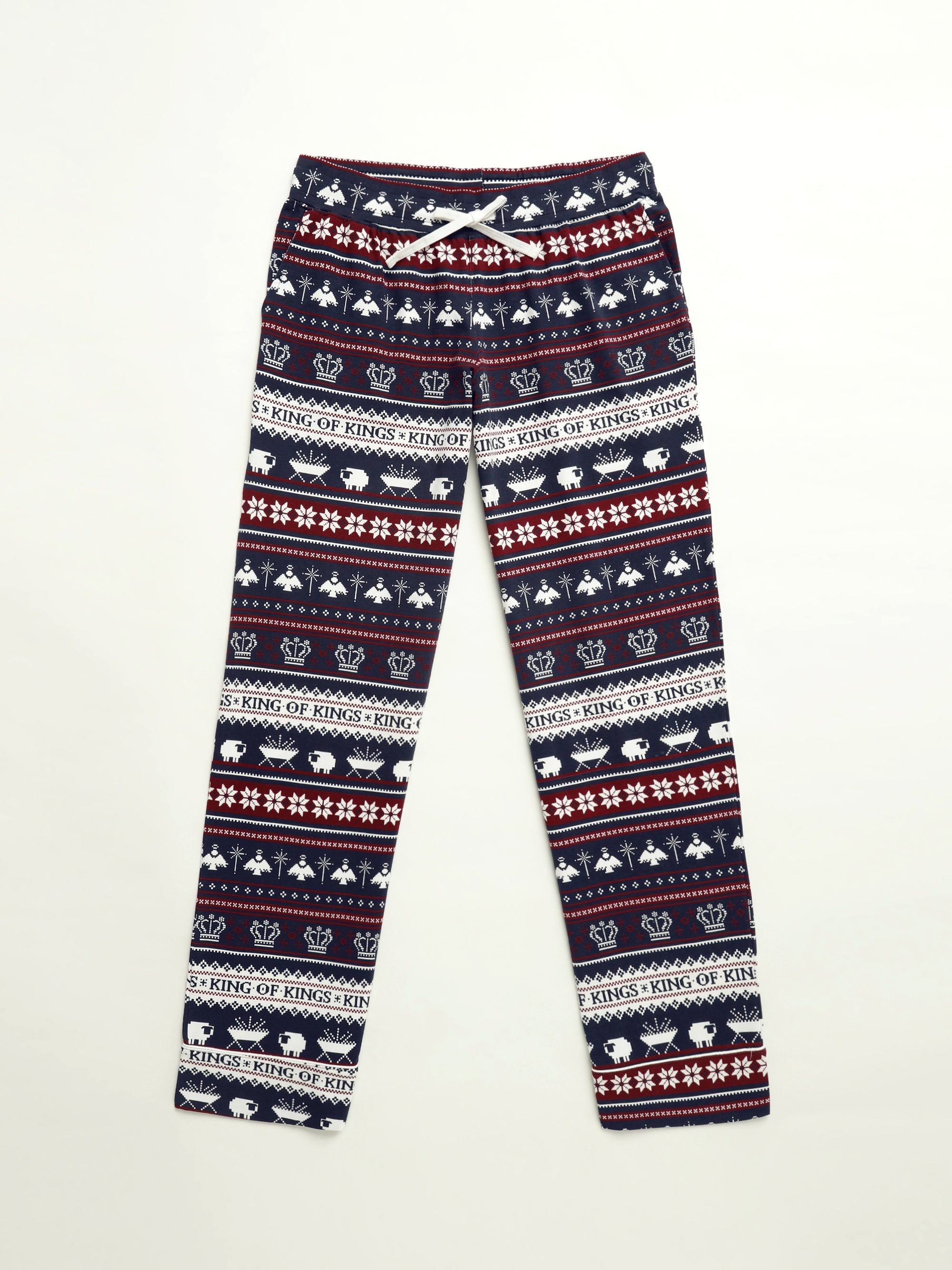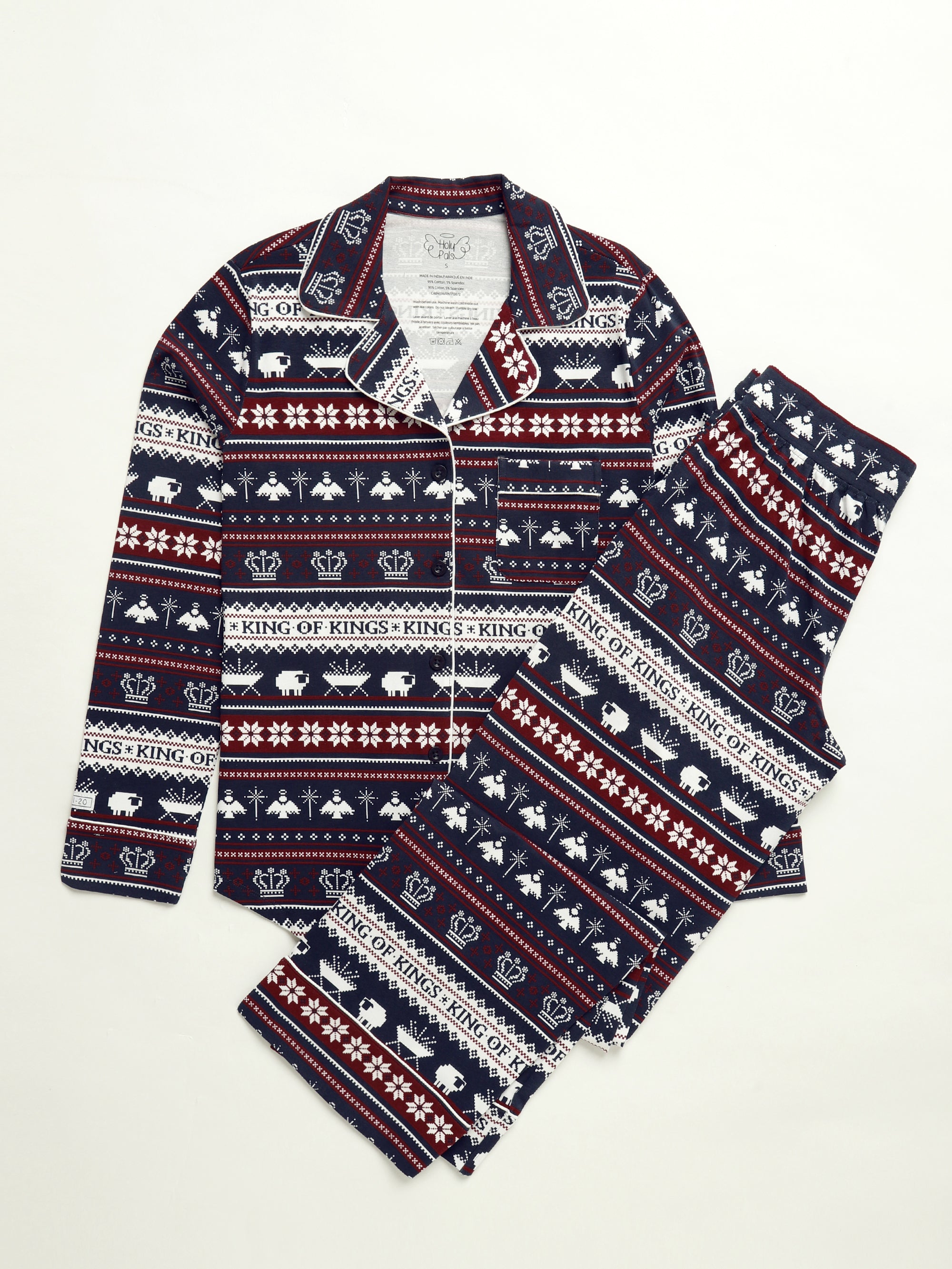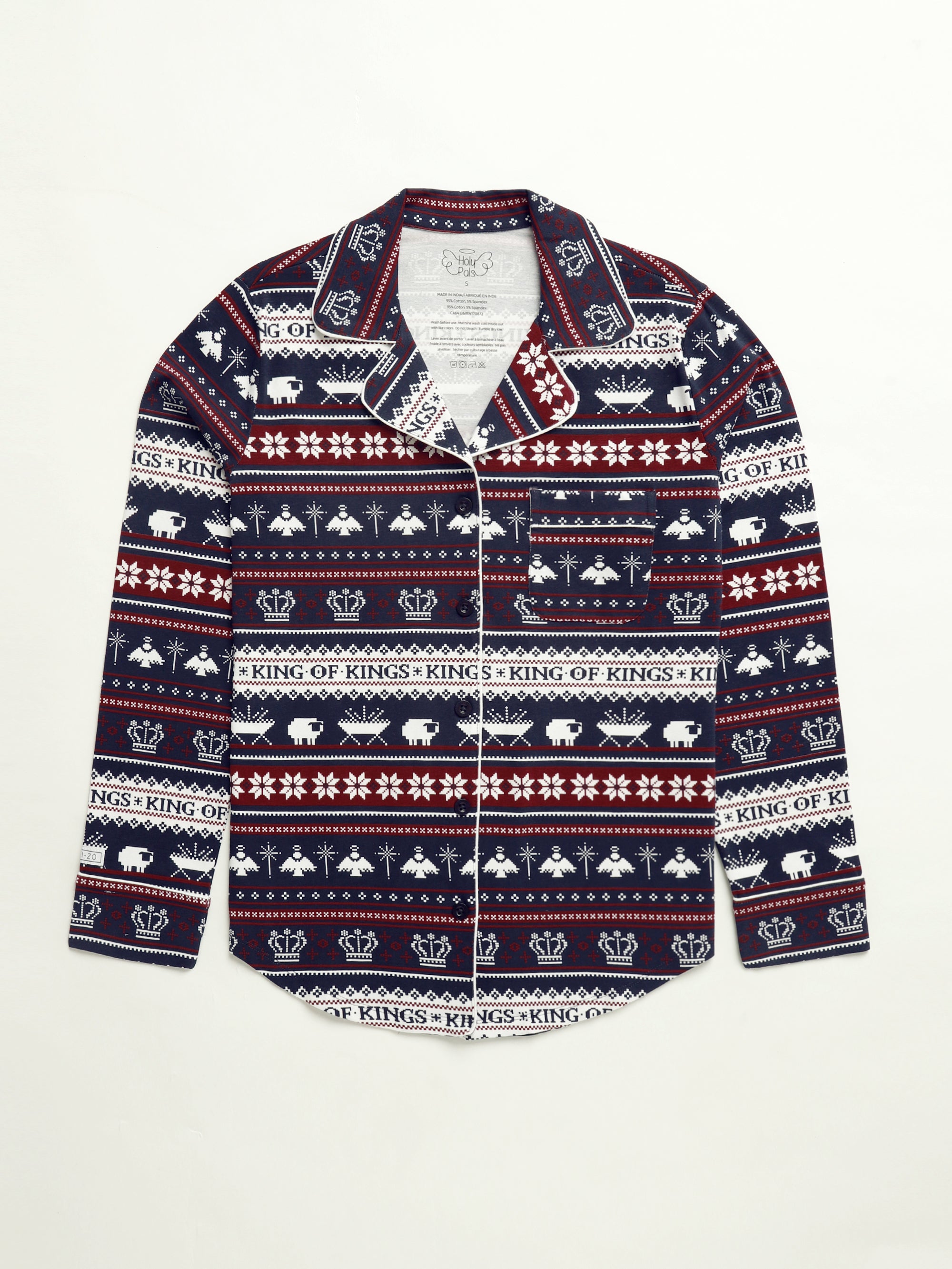Bring beauty and meaning to your Christmas season with our King of Kings Notch Collar Pajama Set—soft, elegant, and designed for comfort you’ll reach for all December long. Inspired by a cozy Nordic sweater, the print pairs deep holiday tones with fair-isle rows of crowns, manger icons, angels, lambs, stars, and the words KING OF KINGS—a joyful reminder that the baby in the manger is the King who came to save. It’s a polished, Christ-centered look that feels as good as it photographs, perfect for family traditions, Scripture reading, and quiet evenings at home.