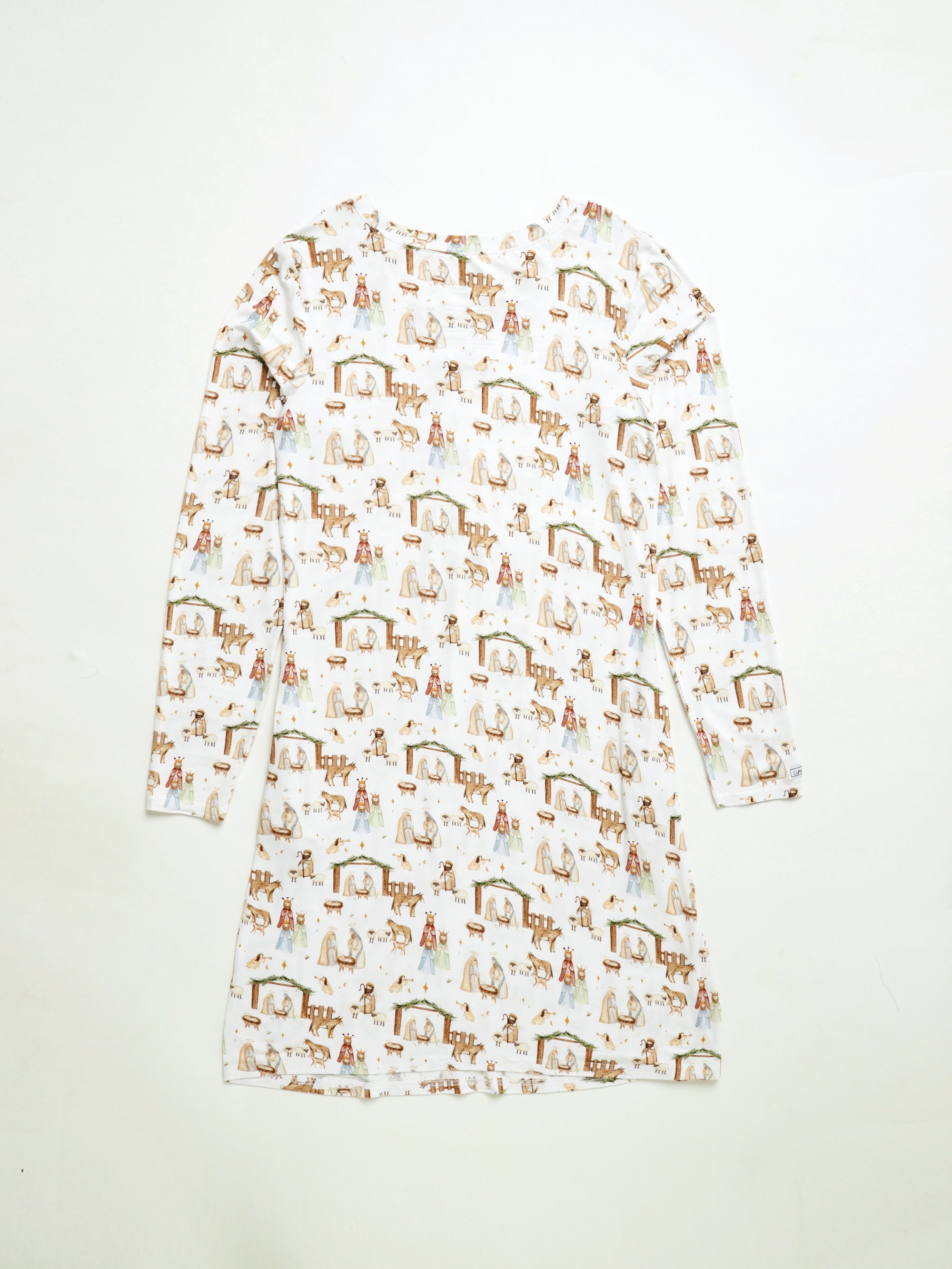 Wear the Nativity beautifully all season long. Our First Noel Nightgown features hand-painted watercolor artwork on a warm white backdrop—Mary and Joseph, Baby Jesus in the manger, shepherds, angels, wise men, and the guiding star—so the story of Christmas stays close as you make memories, read Scripture with the kids, and enjoy quiet evenings at home. Made in our silky-soft bamboo blend, it drapes gracefully, feels breathable and lightweight, and moves with you for restful sleep and cozy nights. The relaxed fit and long sleeves keep you comfortable, while the polished silhouette makes this a favorite you’ll reach for again and again. A right-arm Scripture label (Luke 2:1–20) adds a simple, faith-filled touch.