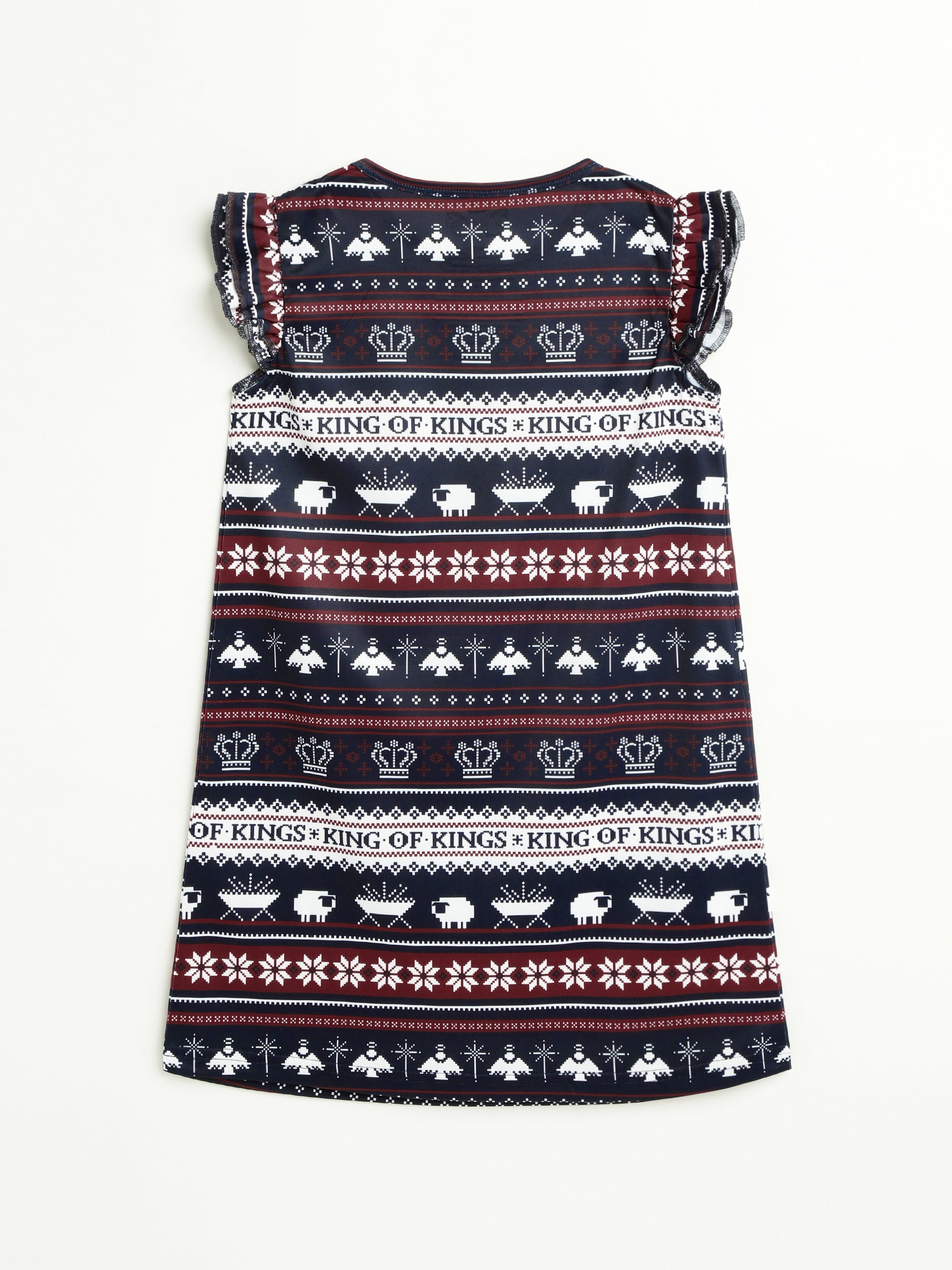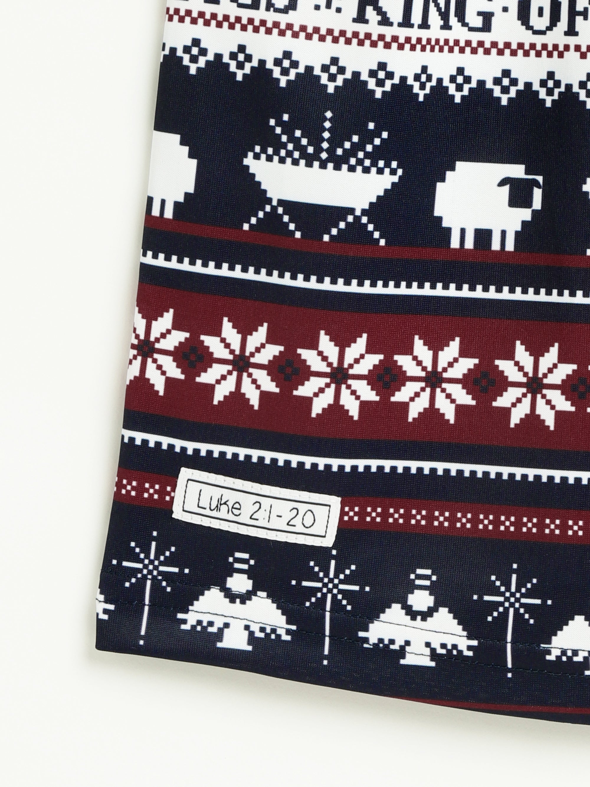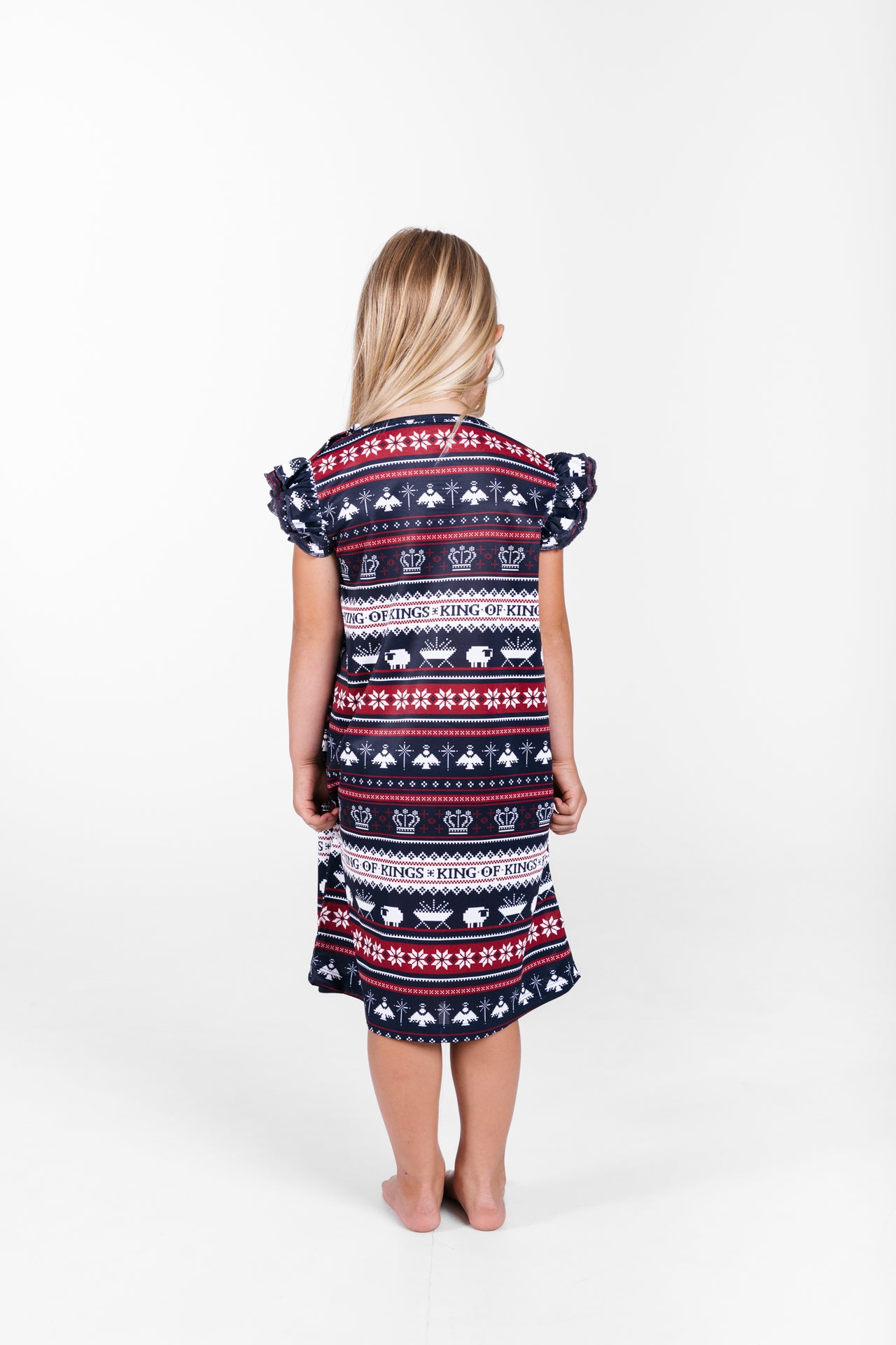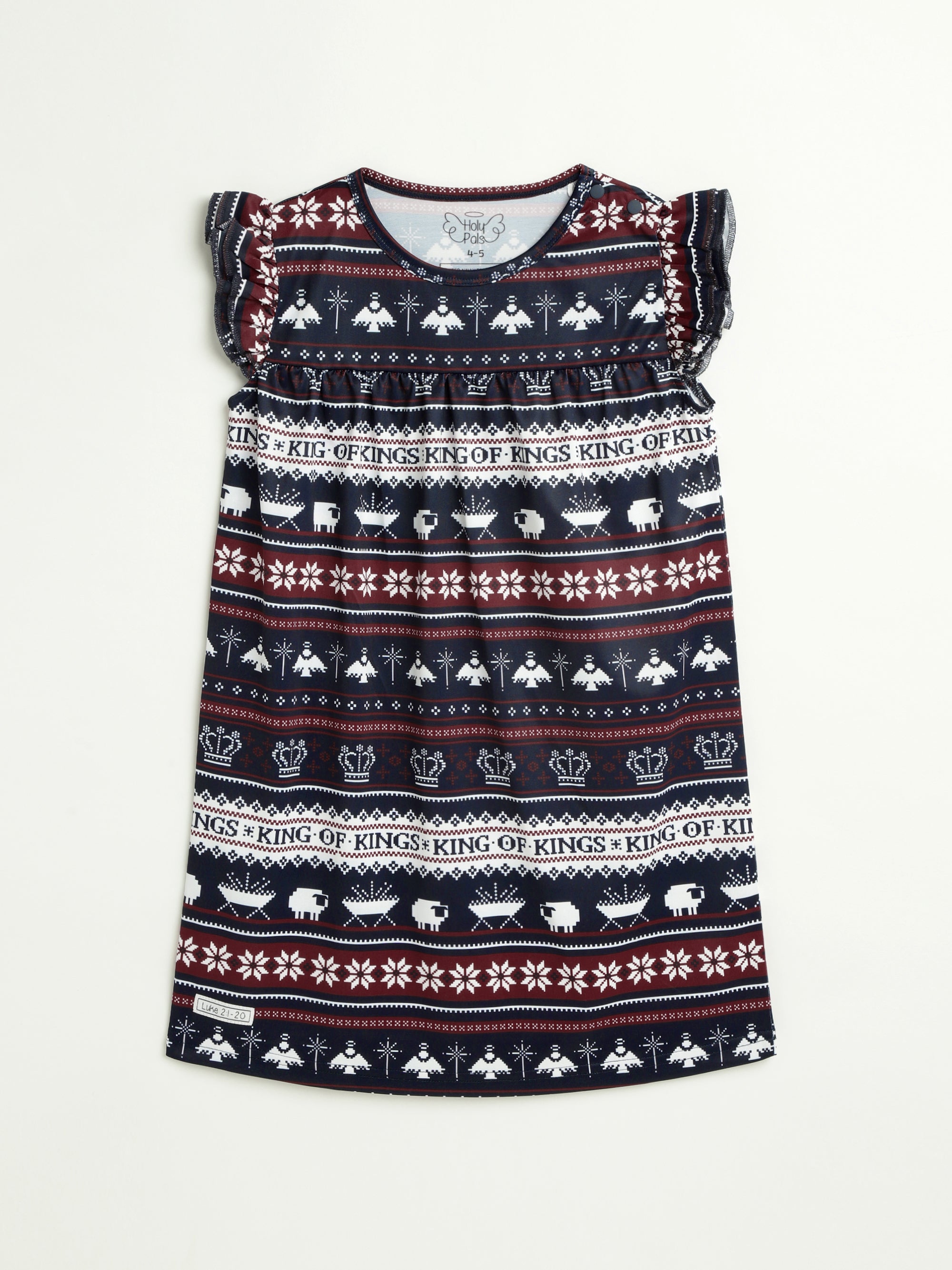Glory to the newborn King! For the girl who loves a dreamy nightgown, this one is as meaningful as it is beautiful. Our King of Kings Nightgown wraps her in a joyful Nordic print—crowns, manger icons, angels, lambs, stars, and the words KING OF KINGS—so the truth you celebrate stays close all season long. Lightweight and smooth with a flowy A-line shape, it’s designed for cozy sleep and twirl-worthy mornings. And with the right-arm Scripture label (Luke 2:1–20), bedtime becomes a simple way for parents and grandparents to share the story of Jesus’ birth.